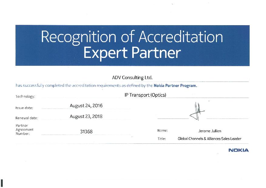 Компания «АДВ Консалтинг» стала первым партнером Nokia в России, получившим высший уровень («Эксперт») по технологиям оптической связи Nokia, и подтвердила свою способность самостоятельно в полном объеме готовить предложения заказчикам в соответствии со всеми их коммерческими и техническими требованиями, обеспечивать без посторонней помощи техническую защиту проектов, проводить демонстрации продуктов для конечных потребителей, обсуждать и поддерживать проектирование сетей, а также разрабатывать архитектуру сети.