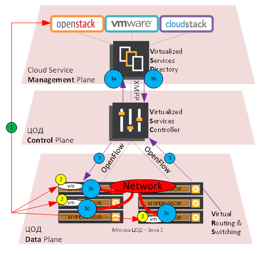 • Virtual Routingand Switching (VRS) – агент маршрутизации и коммутации, который расположенный в модуле гипервизора. VRS– является расширением открытой платформы Open vSwitch (OVS) и представляет собой уровень Data Plane или Forwarding Plane. Этот уровень отвечает за передачу сетевых пакетов между VM в пределах ЦОД. Всю необходимую информацию для организации передачи пакетов VRS получает от VSC по протоколу Open-Flow.